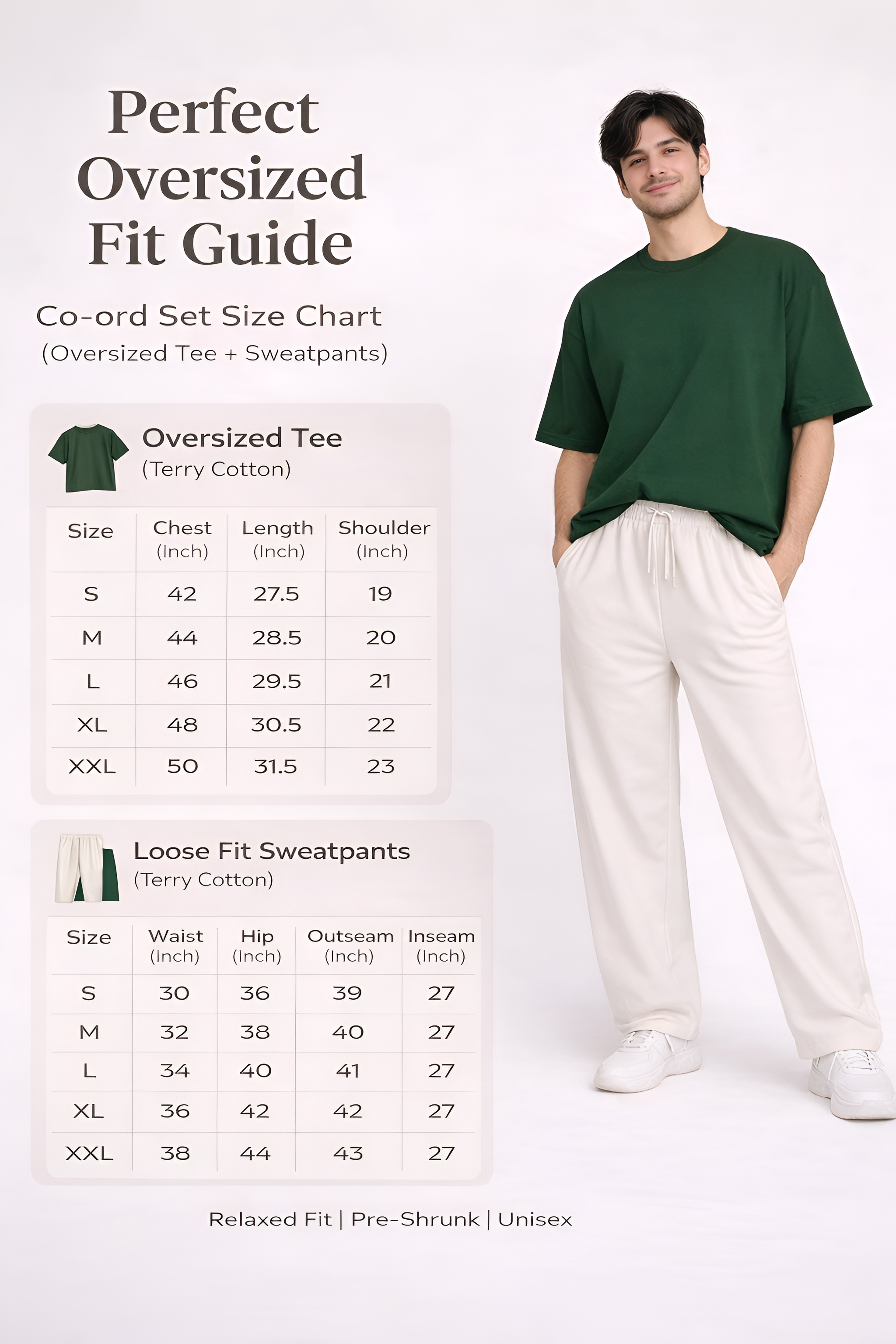To help you pick the perfect size, we've provided a detailed size chart for both Sweatpants & Over-sized Tee.